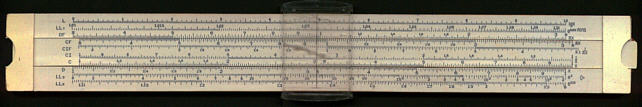 | Notes 1. This rule has a good complement of scales including log-log, trig and inverse scales. Indeed the only non-specialised scales it could be said to lack are the inverse log-log scales. 2. The construction is quite interesting in that it made of a light weight wood with plastic scales. However despite not having the wood laminated as on my only other Russian rule, or with metal inserts, like Faber Castell, it shows little sign of warping.