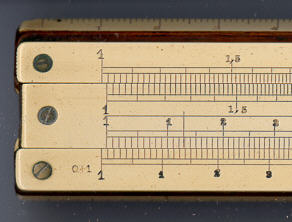 | Notes 1. Dennart and Pape were the company who eventually produced the "Aristo" brand of slide rules. 2. This rule is interesting in that it has two slides. One them is the normal slide found in Mannhein rules of the period with B and C scales on the front and sine, log and tangent scales on the back. The second has log-log scales. One one face there are two scales, labelled E, covering the range 1.07 to 2.0 and 2.0 to 1000. On the other face, labelled -E, they run from .001 to 0.5 and 0.5 to 0.934. 3. The rule is covered by patent number DRP 124,499, which according to Peter Hopp (Slide Rules their History, Models and Makers, p 280) is for the use of "metal or other flexible bottom to join the two halves of the stock". It is rather surprising that the method of presenting the log-log scales was not covered by a patent. This patent was dated 1901. 4. The rule is the same as the one described by C N Pickworth (The Slide Rule, 16 th edition 1919) which he refers to as the Davis Log-log rule. The rule described is identical to the one pictured below and since Davis was known to import D&P rules this fact is not surprising. It is pure speculation but Pickworth was closely associated with Faber Castell, another German company; could it be that he failed to mention the maker of the "Davis" rule for professional reasons? My thanks to Mark Butterworth for providing the images of this rule. His web site is at http://www.priscus.co.uk . |
